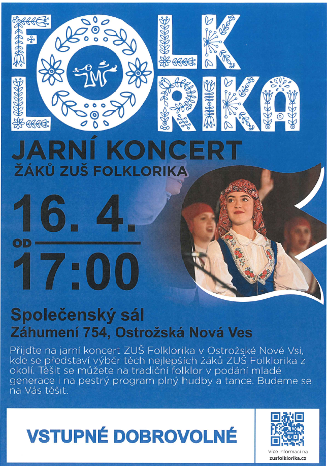 Srdečně vás zveme na Jarní koncert ZUŠ Folklorika, který se uskuteční 16. dubna od 17:00 ve Společenském sále.